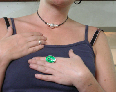 | Soizick is French. She sells her accessories to travelers in her country. Her accessories were made with Art Clay Art clay is used in the same way as Japanese traditional Candy, Kintaro ame. Kintaro Ame craftsman makes many colors of candy rods and stick them together and cut into small piece The cross section of each piece looks like the face of Kintaro who is a character in very famous Japanese fairy tale. Soizick she took 5 day course in Nova art lab and made the following things. An unique Ring with a small moon stone, which she wore in the first knuckle of middle finger. A ring setting an antique glass with question mark. A pendant, which is combination of three spheres. You can see her projects in the photo. |