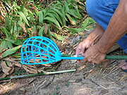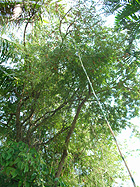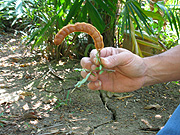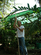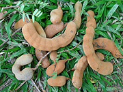 一家に一本欲しいのはタマリンドの木。木陰はとても涼しいし、その実は、そのまま食べる、砂糖がけに a: タマリンドの実。殻に包まれています。 b: 殻を割って中身を取り出したところ。殻の中身のほとんどを種が占め、種の周りのべたべたしたところを食べます。このように茶色のものが熟れていてねっとり甘い。初めはどうしてこんなものをと思って食べ始めたのだけれど、止められなくなる不思議な味。お通じにとてもよい。 c: 青いものもスッパ好きのタイの女の子は好んで食べます。甘酸っぱく漬けたものも人気。 d: 高いタマリンドの木の枝になっている実をとるには、棒の先に写真のような籠状の採集道具をつけます。写真は無粋にもプラスチック製ですが、元は籐製の物が主流でした。 e: タマリンドの高い枝の間になる実を探っているところ g: 木の下で棒をあやつっているお猿。 |