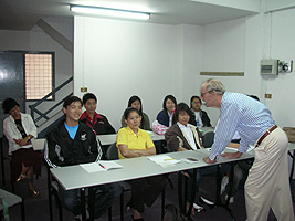 それも一人や二人でなく。なぜなら、彼らも自分の夢の実現のために、着実に 毎日何かを 積み上げているから、できることがあるなら友達に協力しようとしてくれるのです。 場の力もあるのじゃないかしら?チェンマイは自然も物も人の心も豊かな所です。 Rayは、 そういう風に助けてくれて、良い人や情報を教えてくれる、頼りになる友達の一人。 イギリス人の 心理学者です。第二次世界大戦でお父さんが亡くなったので、大学に行けず、 60歳を過ぎてから夢だった心理学の学位をとったという情熱家。彼の最新のプロジェクトはチェンマイ村の助け 合い組合設立。昔、村では村民の誰かの家が壊れたら、皆で協力して修繕し合った ものでしたね。皆が夢をインターネットで実現するために、そういう協同組合を立ち上げよう と活動を始めました。皆ができることを提供しあって、インターネットを使って仕事をしようというのです。 Rayの仲間で、一緒にNLPという新しい、語学やコミュニケーション能力を向上させるためのアプローチ 法の講座を開いているJさんの発行する、チェンマイの日本語新聞 ちゃーおの事務所の 一室を借りて10日間の無料英語教室を開きました。希望者は誰でも参加自由で一週間に 一回、約2ヶ月間の講座です。教材はアメリカの10以上の大学で使われている、ネットビジネス の指南教材いわゆるe-Educationソフトです。 私もちょうど当サイトにWebショップを立ち上げようとしていた矢先だった上、(あともうちょっとで 公開します)、Rayの考えるような協同組合の仲間と一緒に将来寺子屋を設立したいので参加しています。 瑣末にとらわれず、おおづかみにサイトの構想が整理できて、とてもために なります。チェンマイの若い学生や看護婦さんなど、普段知り合えない現地の人と 友達になれたのがうれしいです。英語があまり得意でない人のためには得意な人がRayの説明した ことをタイ語で通訳します。今日は5回目で、普通、この手の集まりでは、どんどん人が減る一方なのに 皆熱心です。クラスにはまだ自分でウェブサイトを作ったことのある人はいないので サイトを作る手伝いは私がします。 以外や以外、チェンマイは実は英語学習の穴場なのです。時間に余裕のあるネイティブスピーカーが沢山 いるので個人教授をつけても高くないですし、何より、習った会話をすぐ使えるのが上達の秘訣です。 語学の学習にチェンマイにいらしてはいかがですか? |